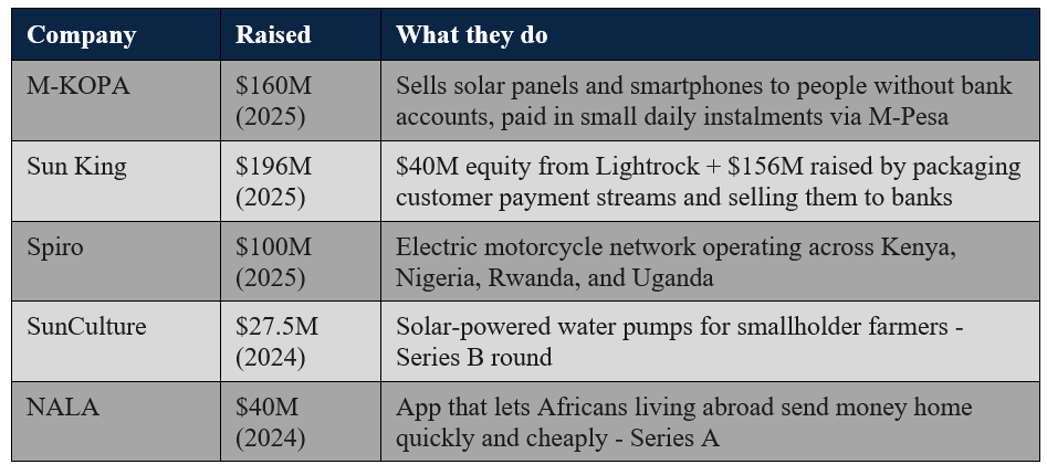 These companies also have physical assets, such as solar panels, motorcycles, and irrigation pumps, that can serve as collateral for loans. In fact, half of Africa's biggest startup rounds in 2025 were bank loans, not equity investments. Sun King combined $40 million in equity from Lightrock with $156 million raised by securitising its customers' future payment streams, a sophisticated structure that reduced its overall cost of raising money.