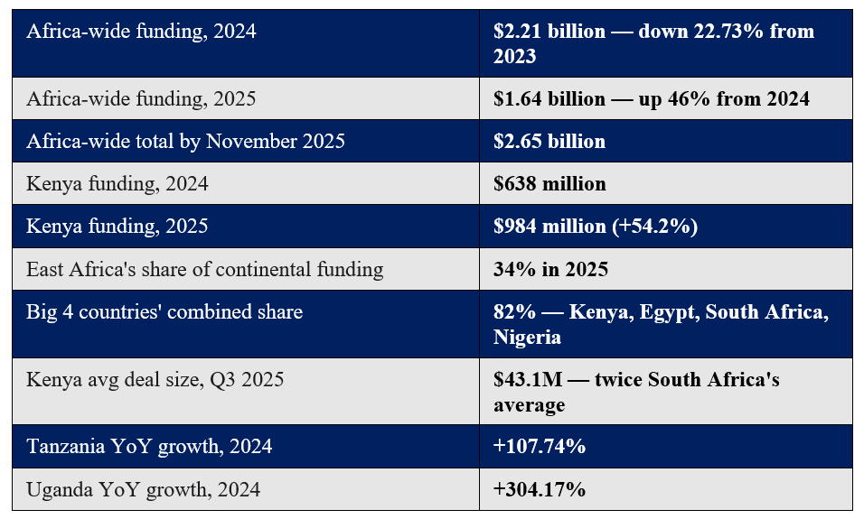 Kenya led the rebound in 2024, capturing $638 million, which was 88% of East Africa's $725 million total before jumping to $984 million in 2025, a 54.2% year-on-year increase. Kenya's average deal size in the third quarter of 2025 reached $43.1 million, twice South Africa's average, a sign that investors are placing large, confident bets on the region. Tanzania and Uganda also showed strong growth, Tanzania up 107.74% and Uganda up 304.17% year-on-year in 2024 showing that the recovery is spreading beyond Nairobi. Across the continent, 178 startups raised $1.64 billion in 2025, and by November that year, the cumulative total exceeded the full-year 2024 figure at $2.65 billion.